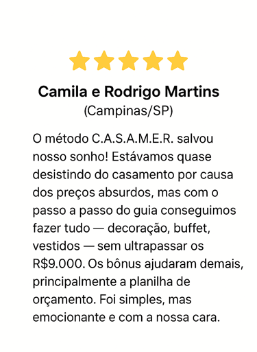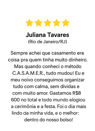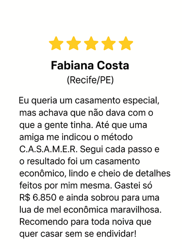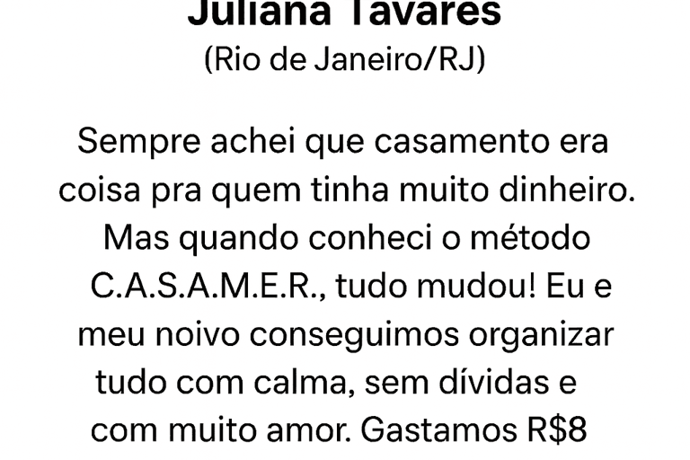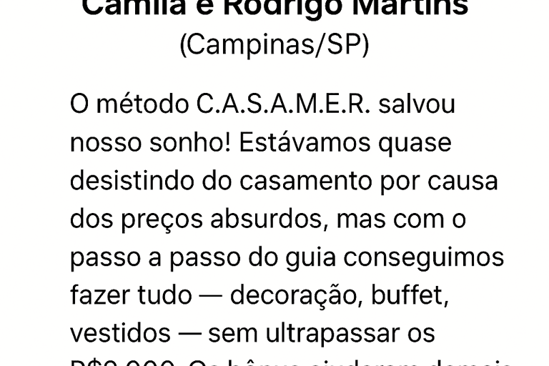 Se você acha que só com R$ 20, 30 ou até 50 mil reais é possível ter uma festa incrível, é porque ainda não conheceu o Método C.A.S.A.M.E.R. — o passo a passo que está ajudando noivas de todo o Brasil a realizarem casamentos perfeitos gastando até R$ 6 mil… e sem abrir mão de nada do que sempre sonharam.
